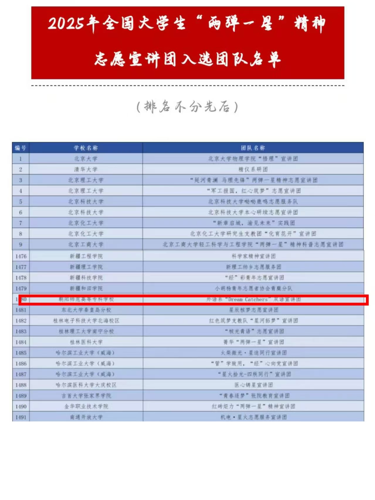 外国语学院“Dream Catchers”双语宣讲团成员杨凯添说:“团队入选后我们深感荣幸,但更懂肩上的责任!”他们揣着“两弹一星”这份民族宝藏,把宣讲开进了校园、朝阳市双塔区新柳城社区、朝阳县娃哈哈幼儿园和昕怡幼儿园——用双语讲那些滚烫的历史,让“热爱祖国、无私奉献”的精神钻进小朋友、青年学生的耳朵里,让更多人了解那段辉煌历史,传承和弘扬“热爱祖国、无私奉献,自力更生、艰苦奋斗,大力协同、勇于登攀”的伟大精神”